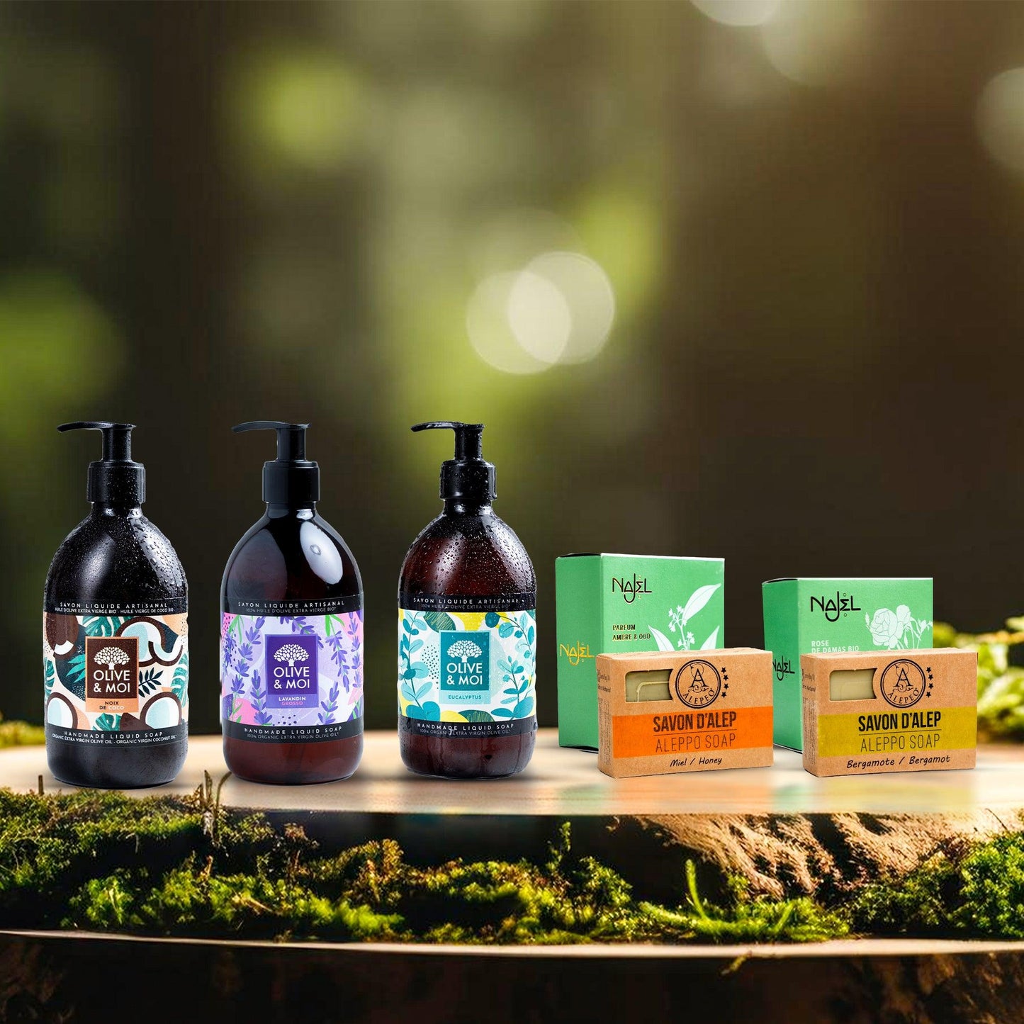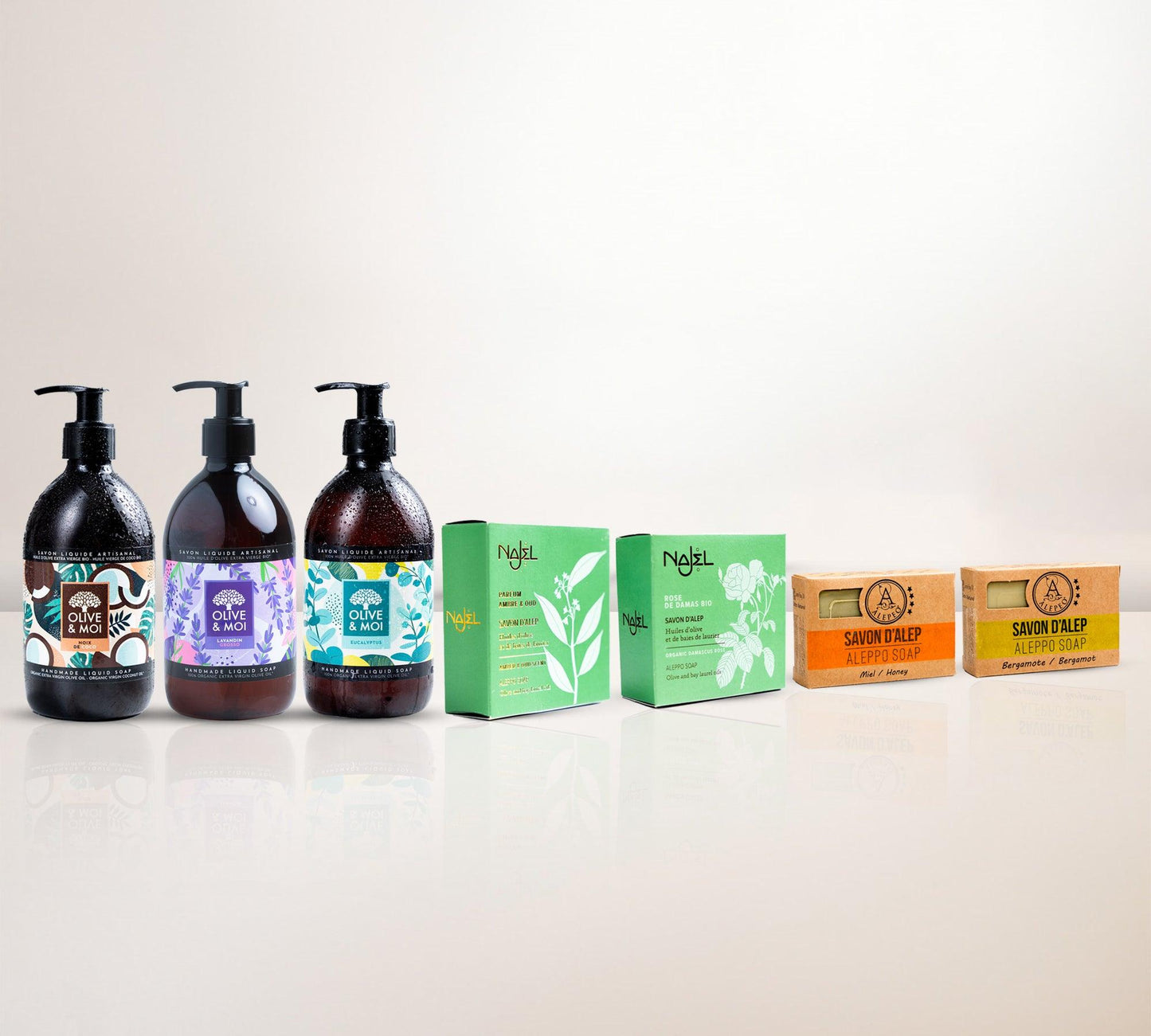 - Amber und Oud Aleppo Seife (150g): Bietet eine reichhaltige, aromatische Reinigung mit den warmen, luxuriösen Düften von Amber und Oud, für ein tief feuchtigkeitsspendendes Erlebnis.